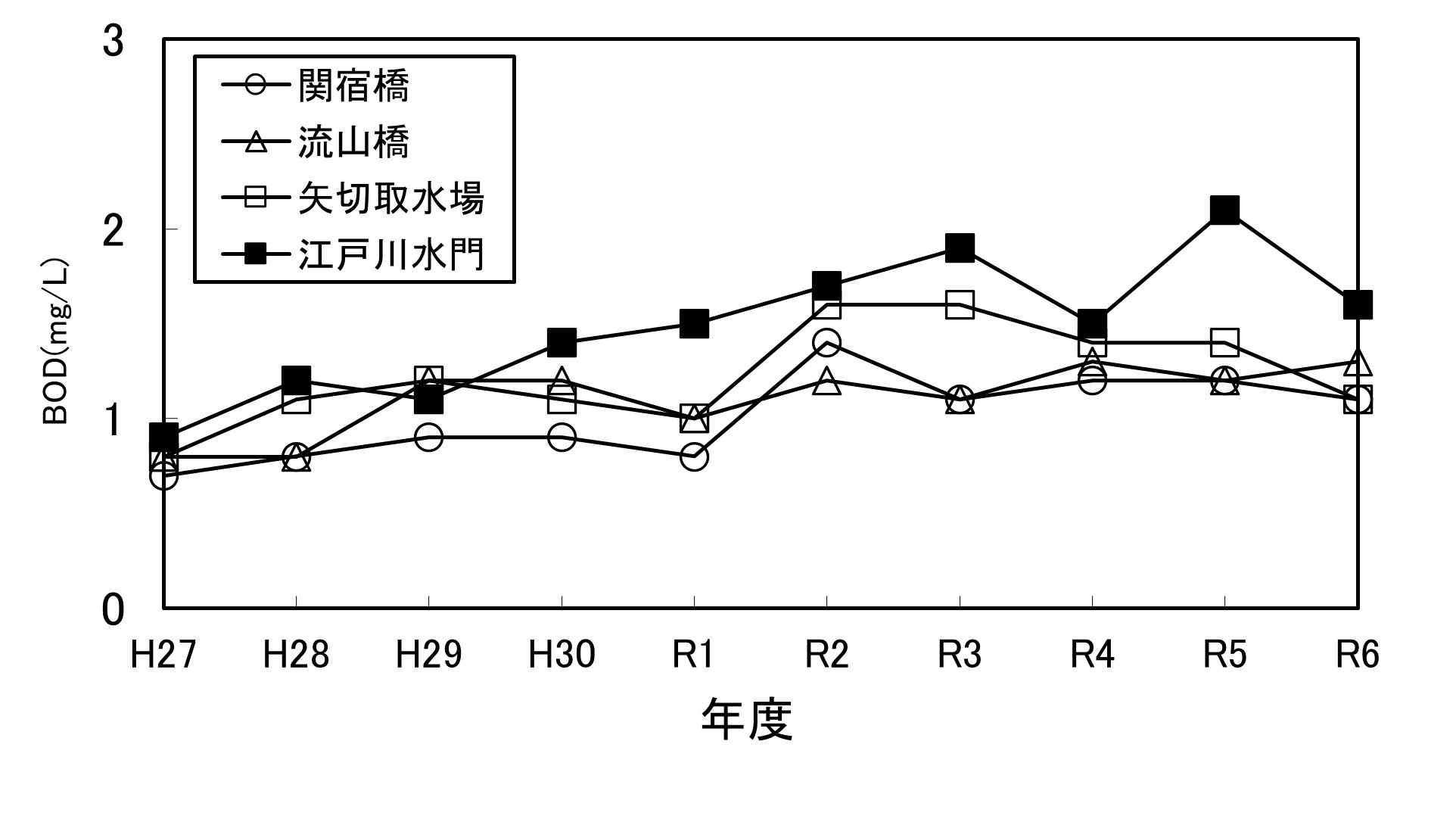 【千葉県】資料編 6.7.1 江戸川の主要地点の水質経年変化(BOD年平均値)